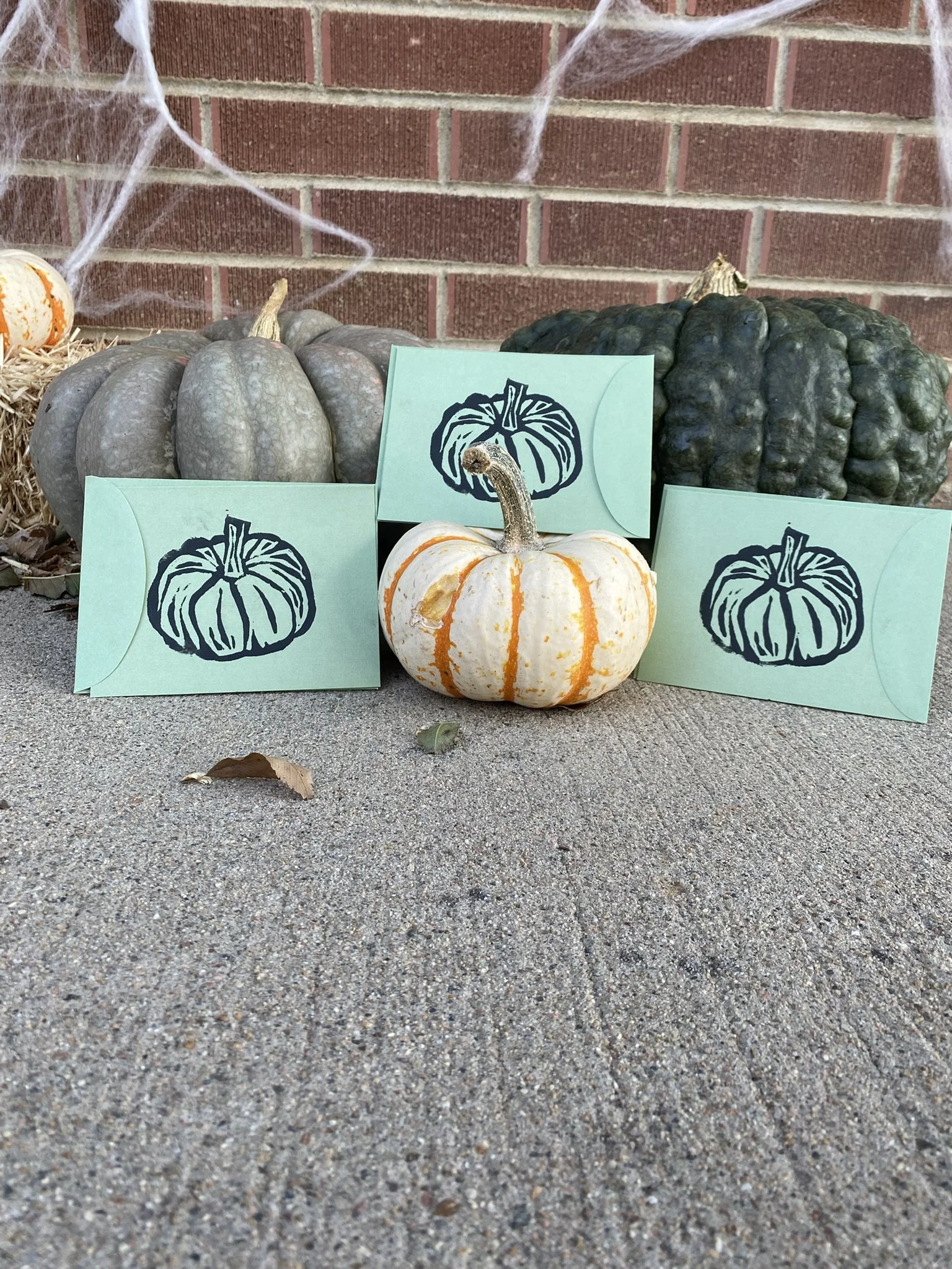 Celebrate the cozy charm of fall with these handcrafted pumpkin greeting cards, featuring unique designs stamped by hand using custom-carved linoleum blocks. Each card is individually printed on red paper and unique. Perfect for Thanksgiving, Halloween, or just sending warm autumn wishes.