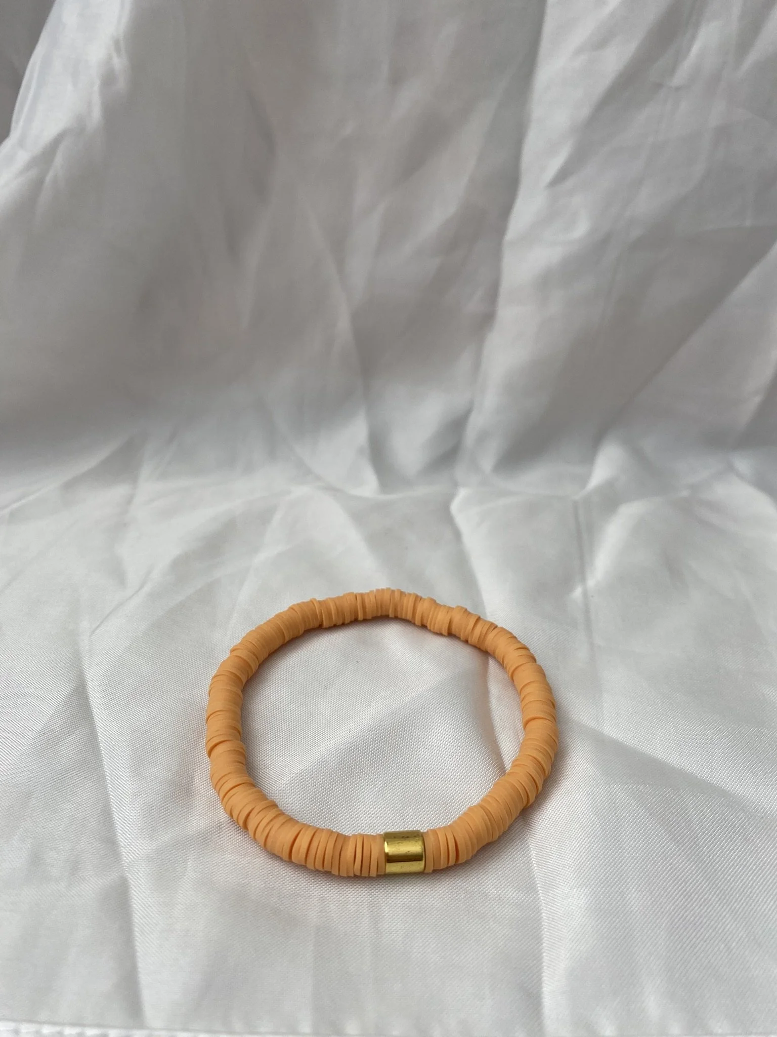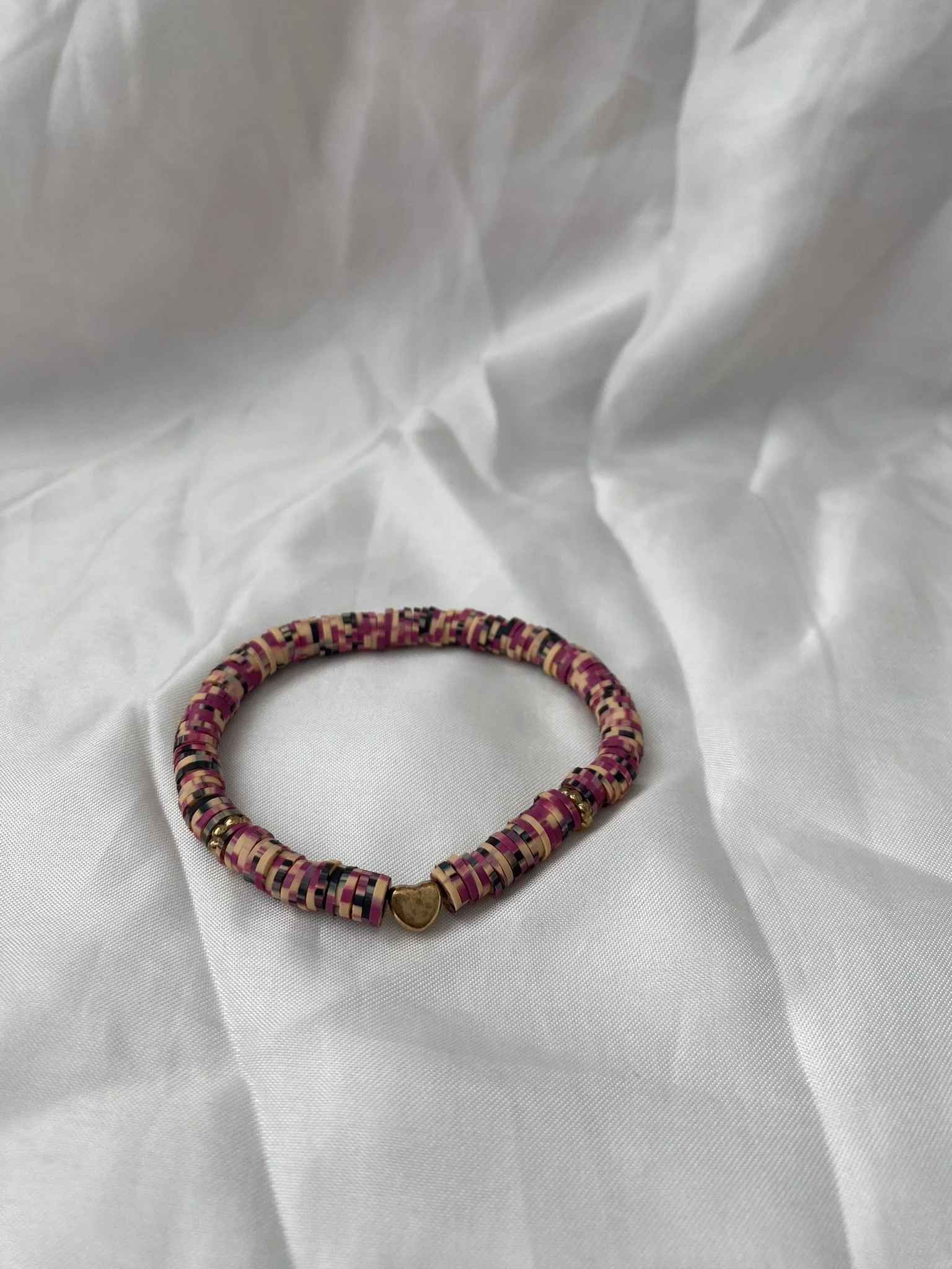 Polymer clay beaded bracelet with black accent charm! “Wednesday Addams.” Fun to add to your bracelet stack or wear alone. These make wonderful party gifts, stocking-stuffers, and presents!